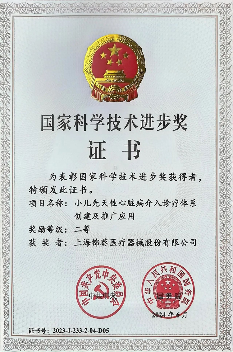 6月24日,全國科技大會、國家科學(xué)技術(shù)獎勵大會、兩院院士大會在京召開。會上公布了2023年度國家科學(xué)技術(shù)獎獲獎名單。其中,創(chuàng)投集團被投企業(yè)上海錦葵醫(yī)療器械股份有限公司(以下簡稱“錦葵醫(yī)療”)參與完成的“小兒先天性心臟病介入診療體系創(chuàng)建及推廣應(yīng)用”項目榮獲國家科學(xué)技術(shù)進步獎二等獎!