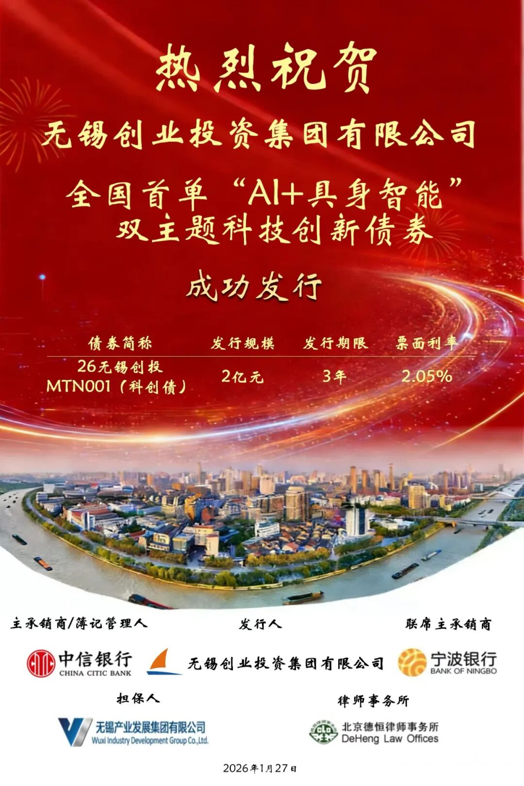 1月27日,全國首單同時聚焦“人工智能”與“具身智能”的主題科技創(chuàng)新債券在錫發(fā)行。無錫創(chuàng)業(yè)投資集團有限公司成功發(fā)行2026年第一期中期票據(jù),規(guī)模2億元,集中投向人工智能與具身智能賽道。這是繼去年成功發(fā)行全國首批科技創(chuàng)新債券后,創(chuàng)投集團再次運用金融創(chuàng)新工具,精準引導社會資本投向科技前沿,為無錫乃至長三角地區(qū)關(guān)聯(lián)產(chǎn)業(yè)發(fā)展注入動能。
